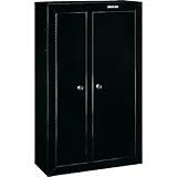 Keep your firearms and valuables locked up right with the Stack-On® 10-gun double-door cabinet. It is designed to hold weapons up to 54" tall. In the regular storage section, the 4 shelves are removable for a customized space. Foam padding on all of the shelves and bottom prevent scratches. This gun cabinet's 3-point locking system is key coded and double bitted for extra security.